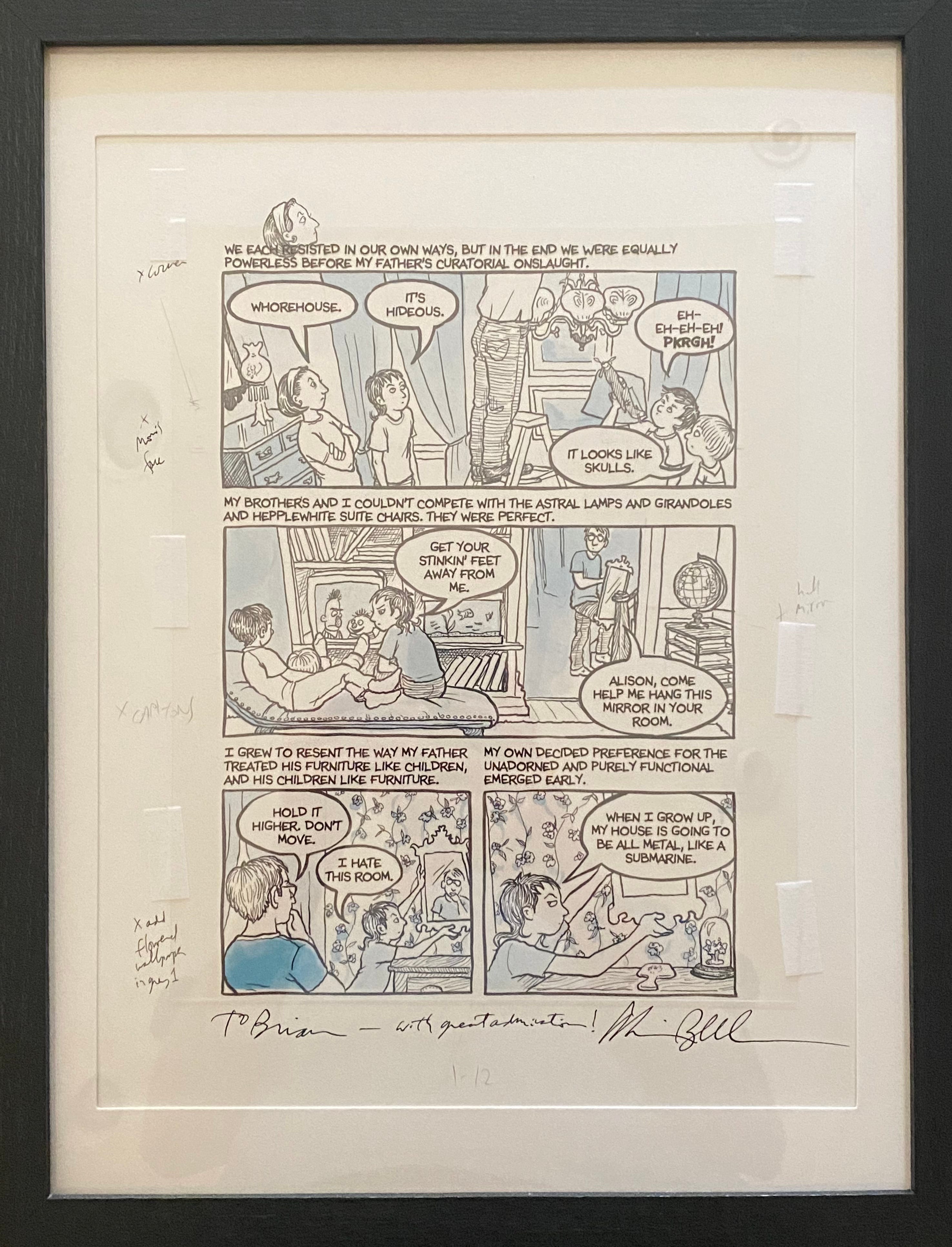 I love this page, and not just because Alison Bechdel bafflingly personalized it to me “with great admiration.” This scene deals with her late father’s furniture collection, and closely mirrors MY family’s exhausted confusion with me and my relentless artistic additions to our home’s walls.