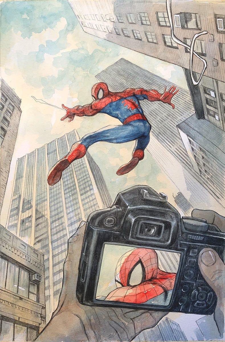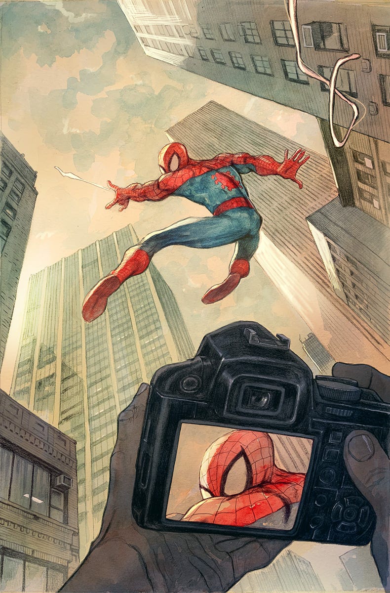 A few years ago, I was assigned a set of four covers for a Marvel miniseries called Spider-Man: Daily Bugle. All covers were finished and paid for but unfortunately, only one of them was published. The cancellation happened at the time we had some kind of worldwide viral pandemic event with a lot of testing and confinements, maybe you remember? So yeah, publishers were forced to cancel many projects, and this Daily Bugle mini was unfortunately on the list.
