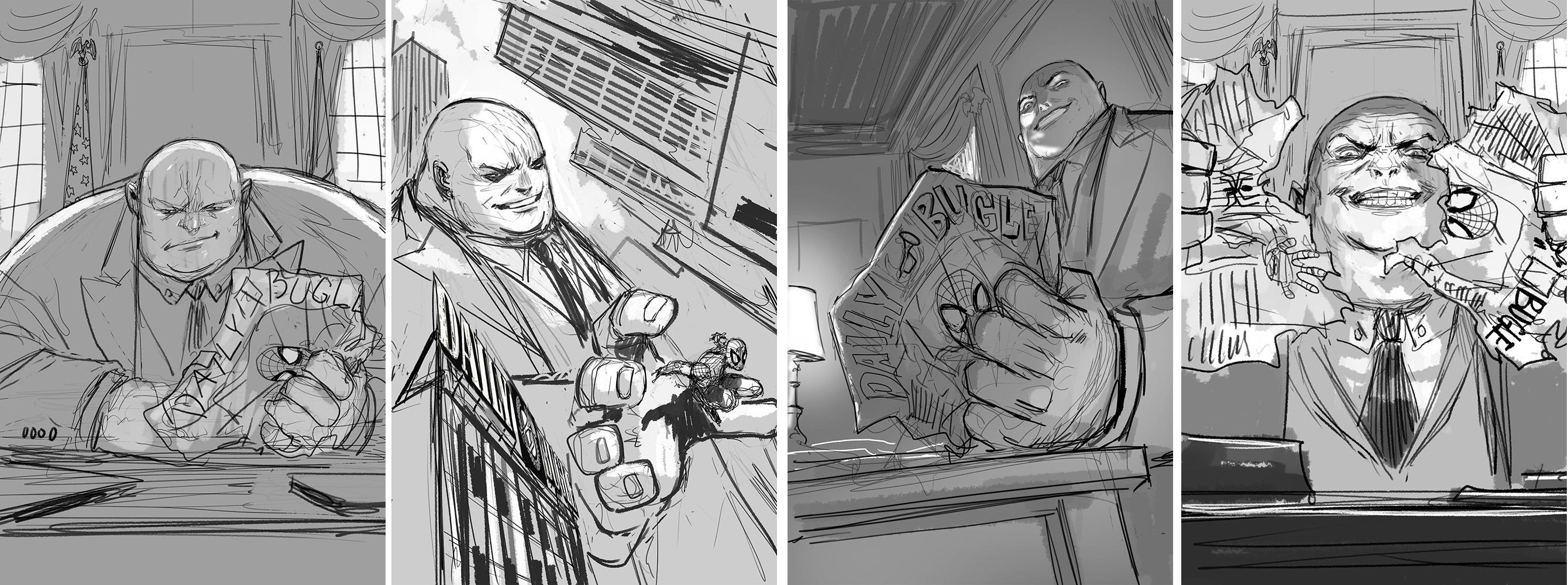The big symmetrical frontal shot was chosen. So the shredded newspaper was very present in the picture and, like a real pro, I made a fake version of the newspaper that I printed at almost standard size. I put it over a real newspaper, shredded it like Kingpin would have, and took a photo of it to use as reference for my final drawing.