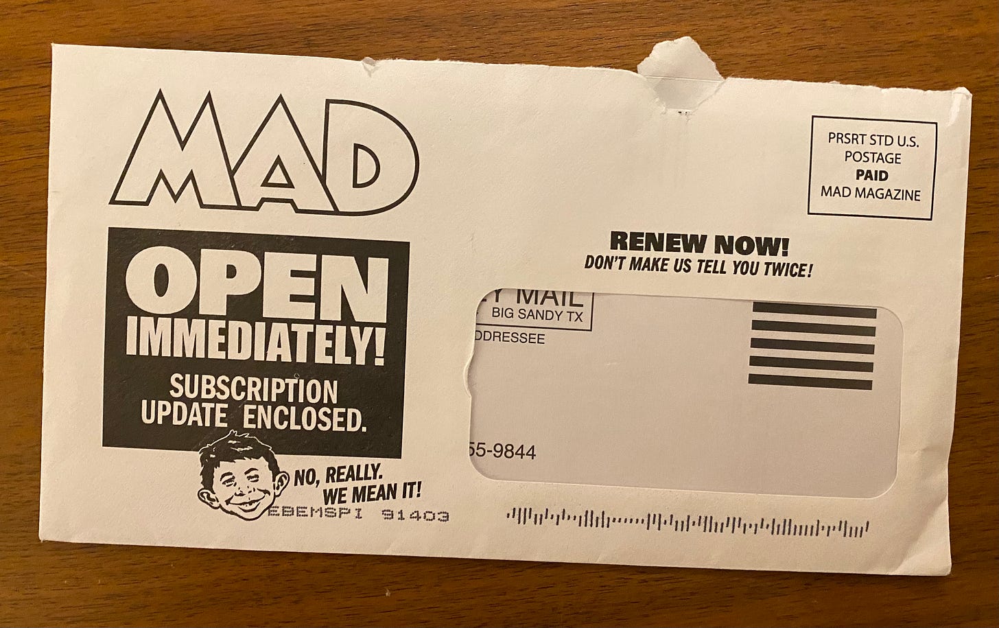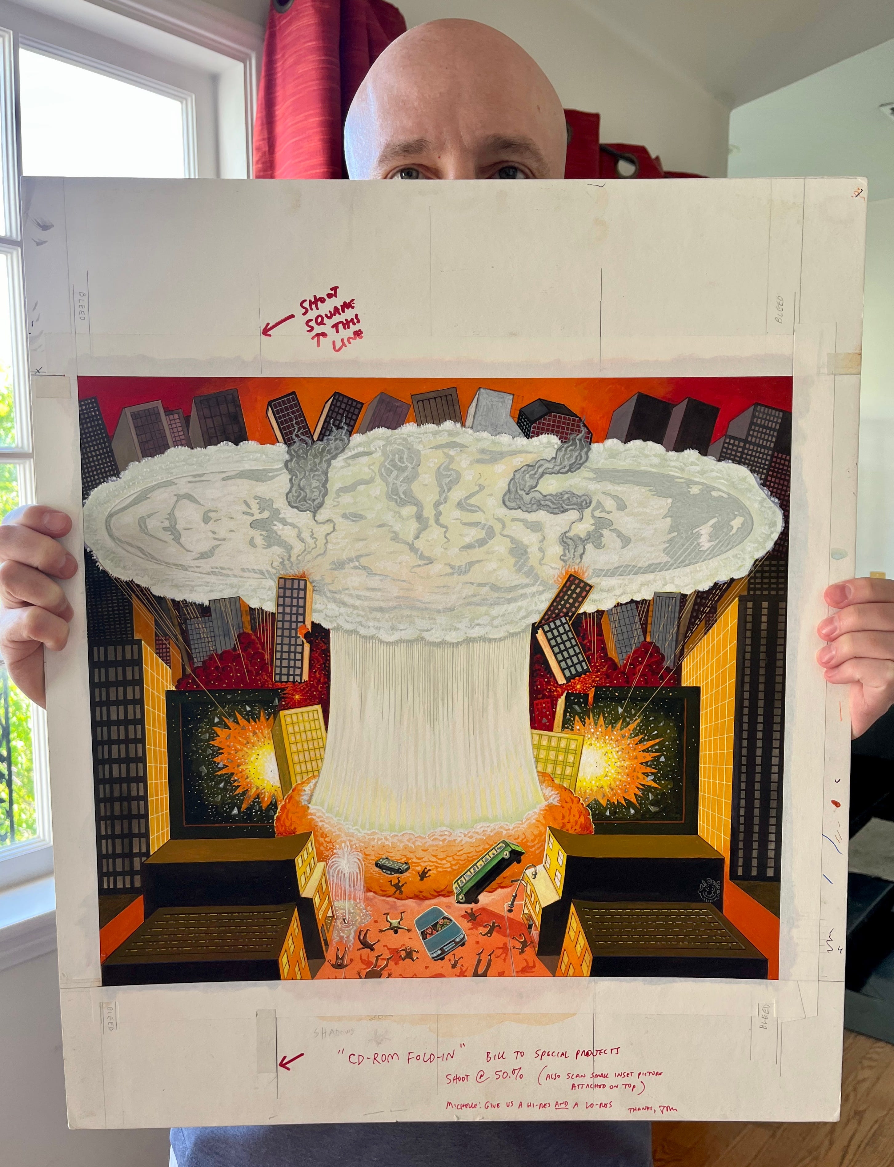 I’m guessing that the original text would have been something like: “What coming technological nightmare threatens the planet?” And Al might have wanted you to believe that the answer would be something about “Y2K” (seen in those eerily prescient falling buildings), but of course, in reality, the folded image reveals the actual self-deprecating answer: a forthcoming Mad CD-ROM, featuring the subtly hidden likeness of Alfred E. Neuman.