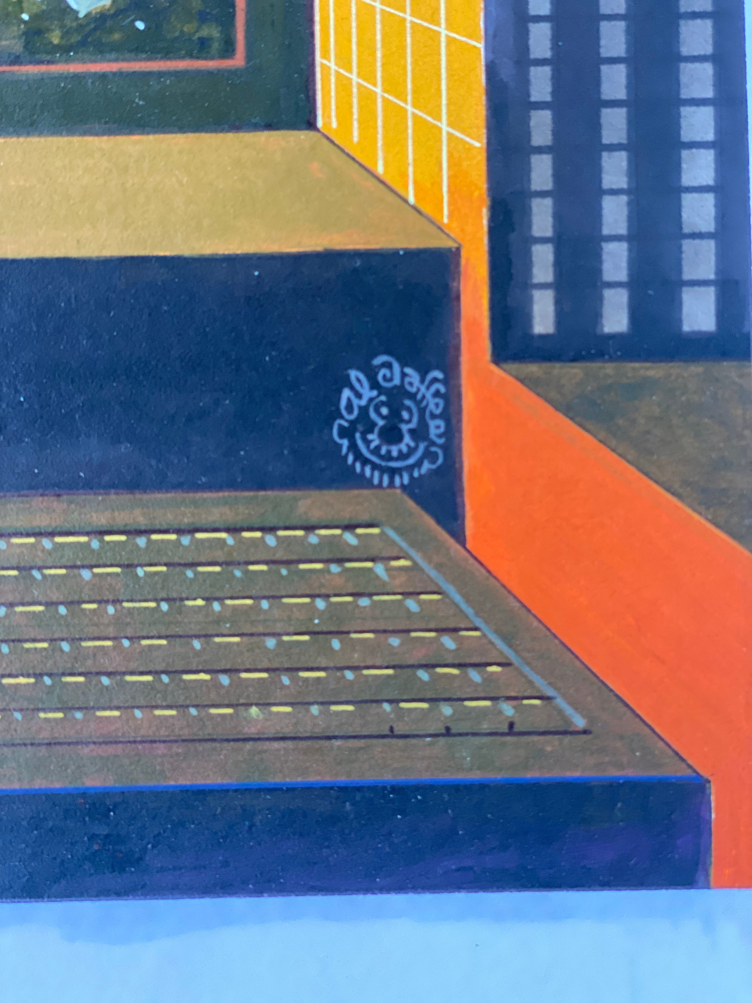 Al Jaffee MAD Inside Back Cover Illustration Y2K “MAD Fold-In” Original Art (EC Publ., 1999). Jaffee’s folding puzzle poses a mystery as to what disasters the Year 2000 might bring. It is unusual to find a “Fold-In” painting without accompanying text, inasmuch as Jaffee customarily applied the typeset areas himself, as part of the finished artwork. Issue specifics are undocumented. Gouache on illustration board, measuring 17" x 15". Slight toning, acetate overlay and red-effect overlay taped at the top, text paste-ups, tape along the sides of the image, corner dings. Signed at lower right. Excellent condition.